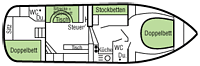 Betten: 6 Maße: Länge 10,90 m, Breite 3,75 m. Ausstattung: 3 Schlafkabinen: davon 2 große jeweils mit Doppelbett und 1 kleine Schlafkabine mit Stockbetten, 2 Du/WC, gro˜er Salon mit Sitzecke = Doppelbett, TV. Badeplattform. Großes Sonnendeck mit 2. Steuerstand über dem Salon.