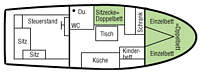 Ausstattung: 1 Schlafkabine (2 Einzelbetten = Doppelbett), WC/Du. Salon mit Sitzecke = Doppelbett.